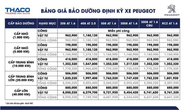 Để khách hàng có đủ thông tin tham khảo về chi phí vận hành và sử dụng xe một cách tổng quan nhất. Chúng tôi cung cấp bảng chi phí bảo dưỡng theo từng cấp độ từ 1000km đầu tiên đến 40.000 km. Lưu ý, chi phí này chỉ mang tính chất tham khảo và có thể thay đổi theo từng thời điểm.