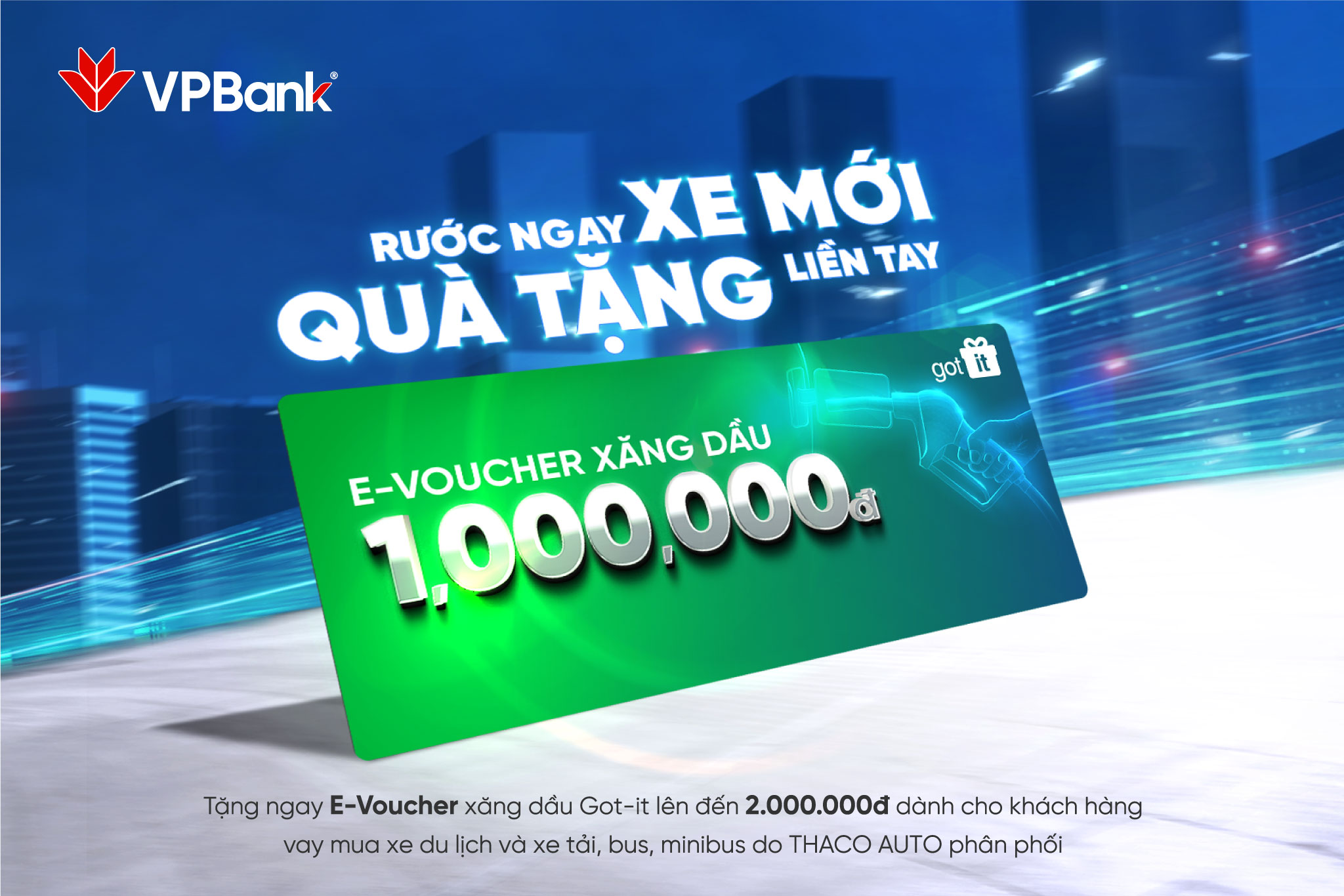 Từ nay đến hết ngày 31/01/2022, khi khách hàng cá nhân vay mua xe ô tô tại hệ thống Showroom/ Đại lý THACO AUTO trên toàn quốc và được phê duyệt, giải ngân thành công qua VPBank sẽ được tặng ngay E-Voucher xăng dầu Got-it.